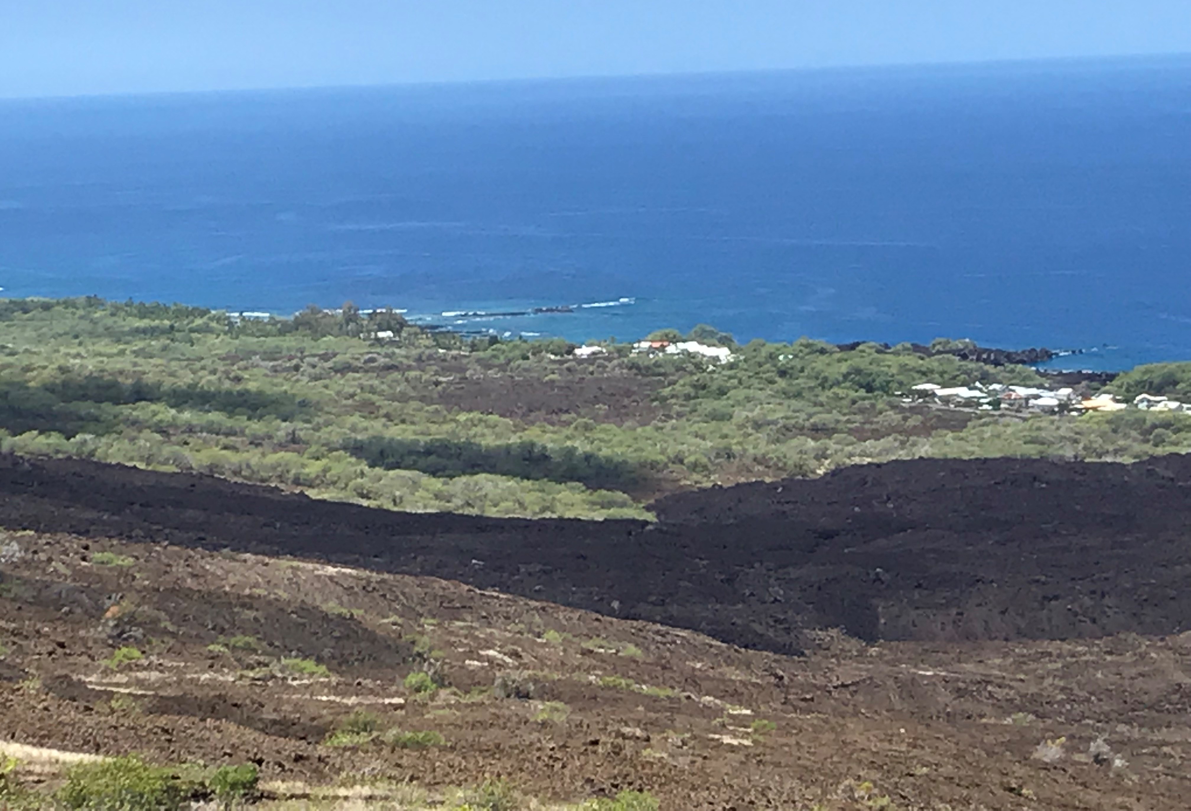 I left Kailua-Kona on Friday June 21st, Summer Solstice day, then drove 40 miles south to the village of Ocean View an area of sparsely developed subdivisions on the south slope of Mauna Loa. For those keeping track of my location on your Carmen Sandiego World Map I’m at co-ordinates 19.0888888 North and 155.751111 West. The house has electric, hot water, a full kitchen, wifi and a rain water catchment for bathing/cooking. Very much like the off the grid place I stayed at in Captain Cook early last month. A very nice place sitting on a quiet street with no close neighbors excepting the 2 cats living under the house (Frankie’s shape shifted felines) who like to rough and tumble wrestle on the front porch around 9 every evening. Very little light pollution I have a clear view of the beautiful night sky and its millions of stars, the Milky Way and trouble finding the pole star. This is the last compass point on the island map I had planned to visit. The island is big and impossible to explore from any one place. Starting in Hawi on May 17th put me at the north end where I and the late May visitors set out our days – Volcanoes Park, Kailua, Waipio Valley, the top of Mauna Kea and many places in between. I moved from there to the middle west side and Captain Cook at a hideaway with the intention of taking more time to relax. Nine days later I’m meeting with Sharon at the Kona Airport where we drive first to the east side and Hilo for a week followed by a trip back to the west shore and Kailua-Kona. After leaving Sharon at the airport on Thursday June 20th I traveled here to the south end staying until July 13th when I meet up with my next visitors.