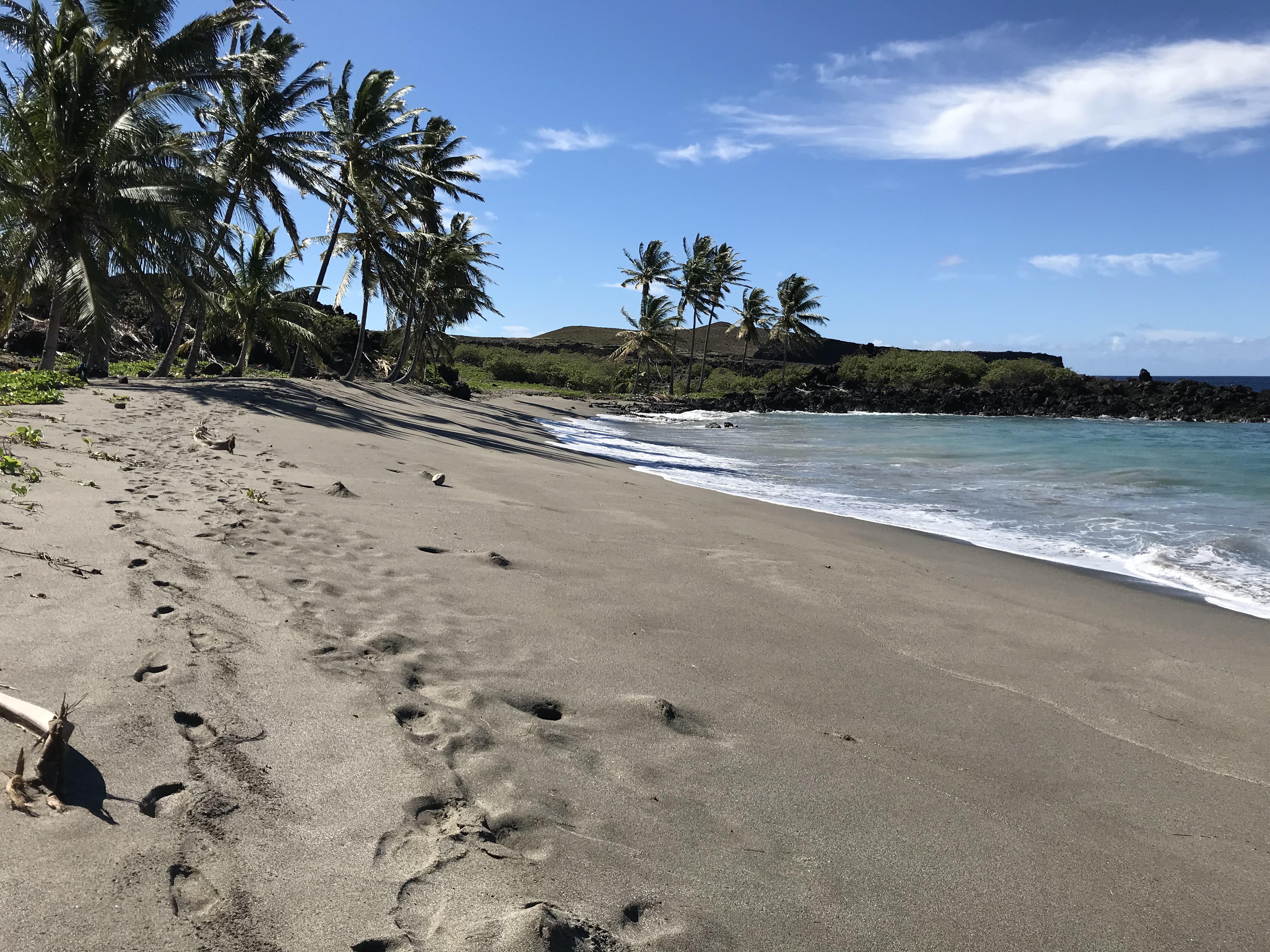 What have I been doing these past 12 days you might wonder. Checking my map for sights to see I decide to take a drive the first Saturday to a place called South Point then driving a bit further east on Hawaii Belt Road to the village of Naalehu. These weeks I’ve made visits to State Parks – Whittington Beach and Manuka, where I mistakenly decided to hike the narrow rocky 2 mile trail on a day after it had rained. The mosquitoes swarmed me whenever I stopped which was somewhat of an annoying disappointment because the hike has many marked off places to observe the different plants and sections along the trail. I had to keep moving or else get picked up and carried away! Whittington Beach, when I researched it later, was recently the site of a murder, yikes! (think that was drug related) . I liked the park, not much of a beach here or most of the windward side parks because of the heavy surf pounding up against the shore. Every village I’ve driven through has a coffee shop and bakery. It’s Hawaii and Kona coffee is world famous. Fresh and delicious baked goods should never be passed up so yummm! Snorkeling trips to Two Step and Kahalu’u Bay on separate days. Both places are parts of early Hawaiian village life. Two Step – Honaunau Bay, is adjacent to the National Parks site “Place of Refuge” (I posted about during Sharon’s visit). Kahalu’u Bay on the other hand is close to the town of Kailua and as shown on the 1948 map below was a thriving community that has lost its historical character. The Kaha Lu’u Beach site shown on Henry E.P. Kekahuna’s archaeological inventory sketches out the locations of heiau’s (places of worship) used for good surfing, a solar calendar, a women’s worship place and a place for sacrifices. The site in 1948 still had remains of special bathing pools and enclosures that only Hawaiian royalty and the upper classes were permitted to use. Most of that is gone now in its place are parking lots, a beach, snorkeling spots, hotels and houses. Of the two I much prefer 2 Step for snorkeling. The water is deeper and the surf is not as choppy, where I found the water at Kaha Lu’u too shallow and too crowded having to share it with surfers and snorkelers. The coral is different too seems the seawall shown on Kekahuna’s map has led to sand covering the coral and to a bathtub like wash movement in the currents. I was being moved this way and that whether I wanted to linger or swim in a particular direction. Last Friday I drove to Volcanoes National Parks Visitor Center to help with the clearing out of Himalayan Ginger. The plant was brought here, it is assumed, for gardens and has now invaded many parts of the park. It was a misty morning as a group of 10 worked on a section of hiking trail that was overgrown with the plant. Using our loppers I and another person working together, as well as the others, would cut the stalks about a foot off the ground leaving the rest for Park folks who are coming in later to spray the tips. We worked until my partner was stung by a wasp, took a break then worked a little more before ending and hiking back up to the visitors center. The stuff is everywhere our small group barely made a dent. On the return trip to Ocean View I stopped at Punalu’u Black Sand Beach park. The website Atlasobscura describes the park as: Known formally as Punaluʻu Beach on Hawaii’s Big Island, the volcanic sands create one of nature’s most stunning scenes. Unlike other beaches, the black sand of Punaluʻu is made almost exclusively of basalt that has washed up from beneath the waves. As underwater lava vents extrude magma out into the ocean the super-heated rock cools so quickly that it often explodes into the tiny basalt particles that continually feed the unique beach. The area is also home to a handful of unique species of endangered wildlife such as the Hawksbill Turtle and the Hawaiian Monk Seal which are shockingly common on the jet sands. The Black Sand Beach is yet another of the island state’s one-of-a-kind natural wonders.