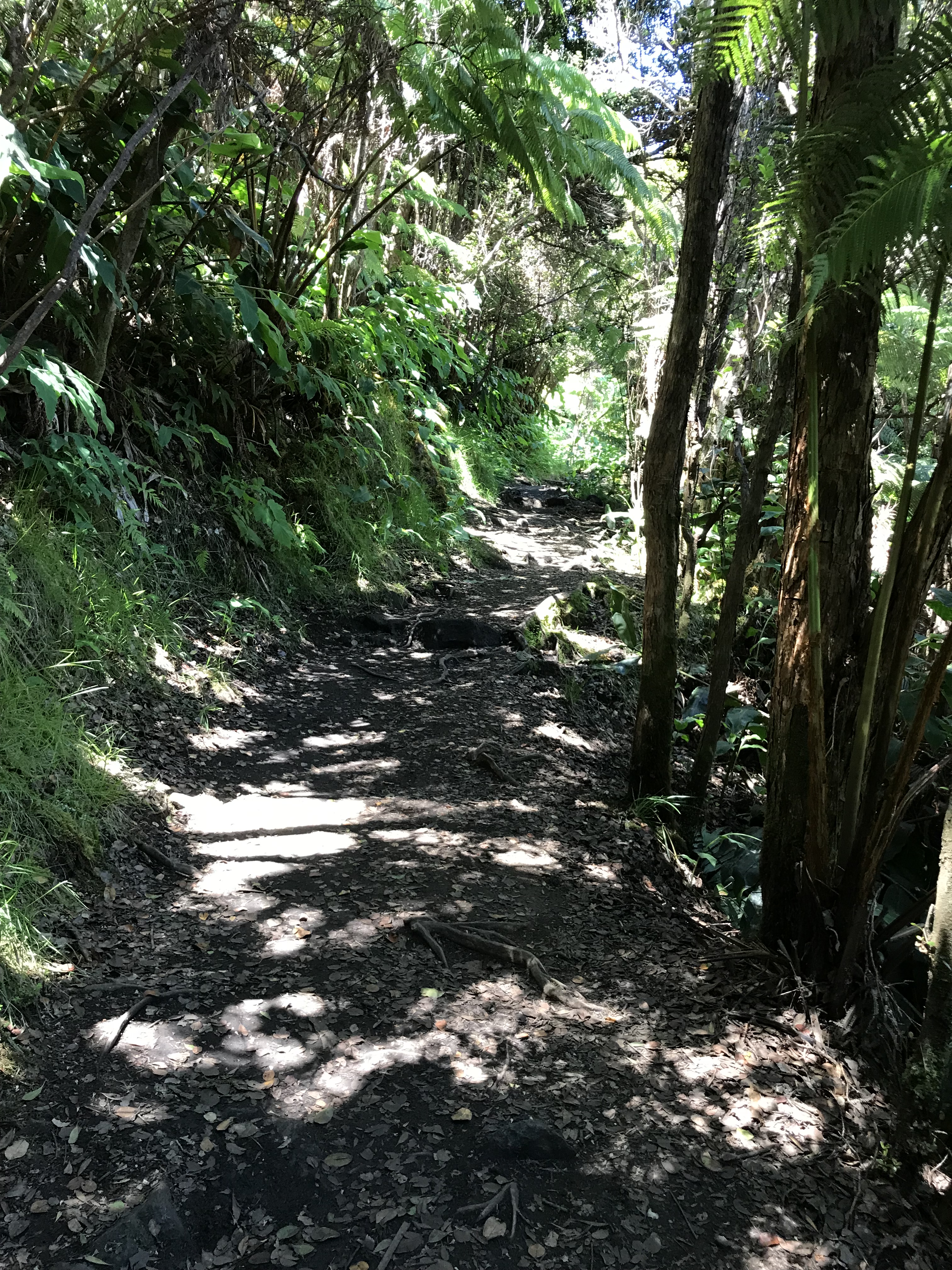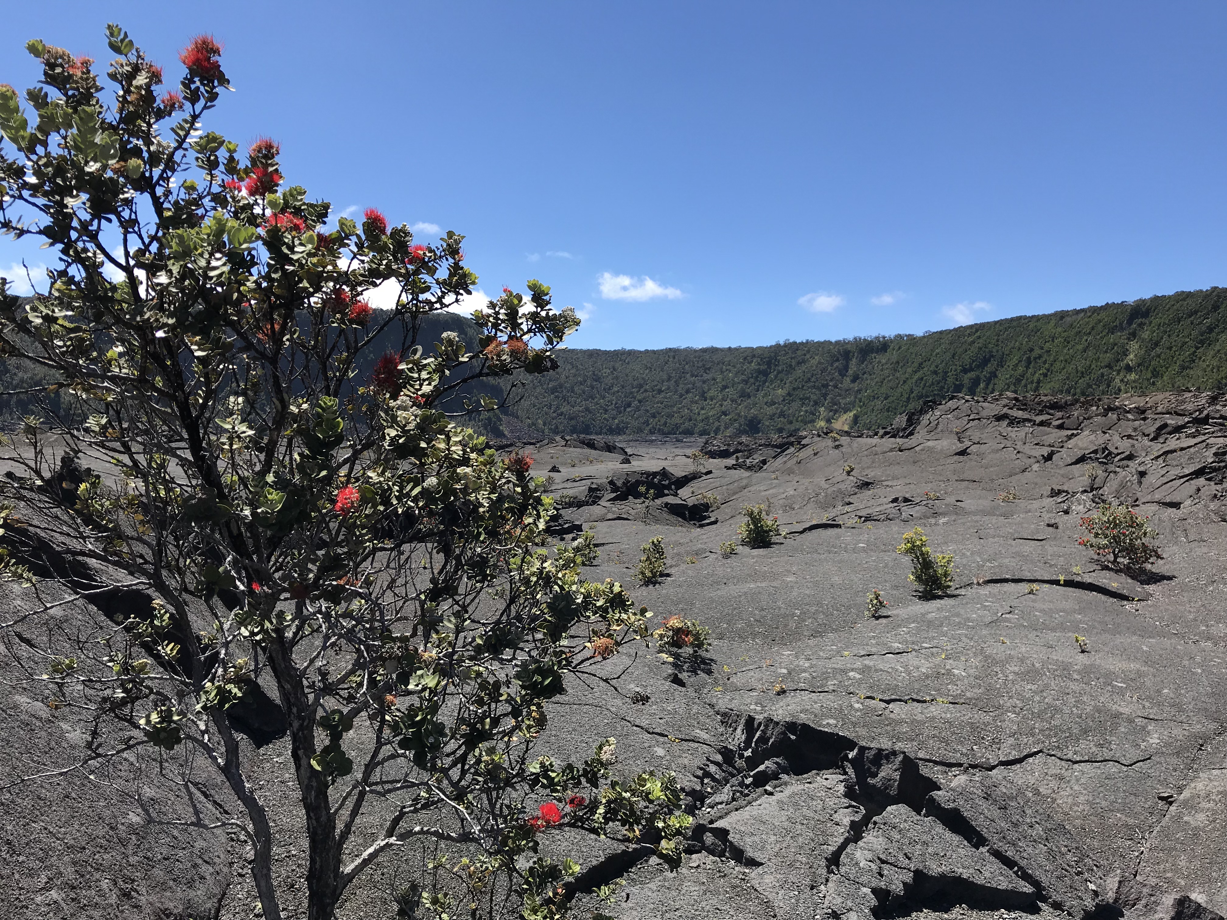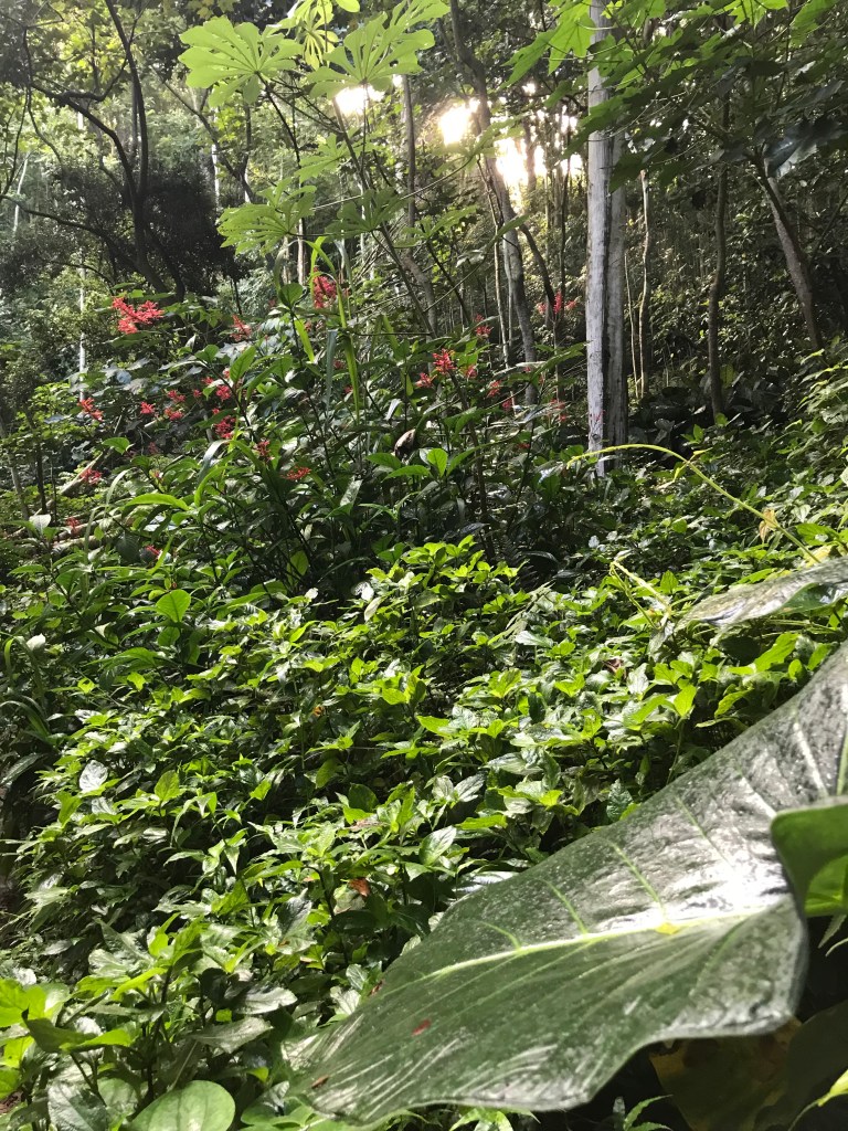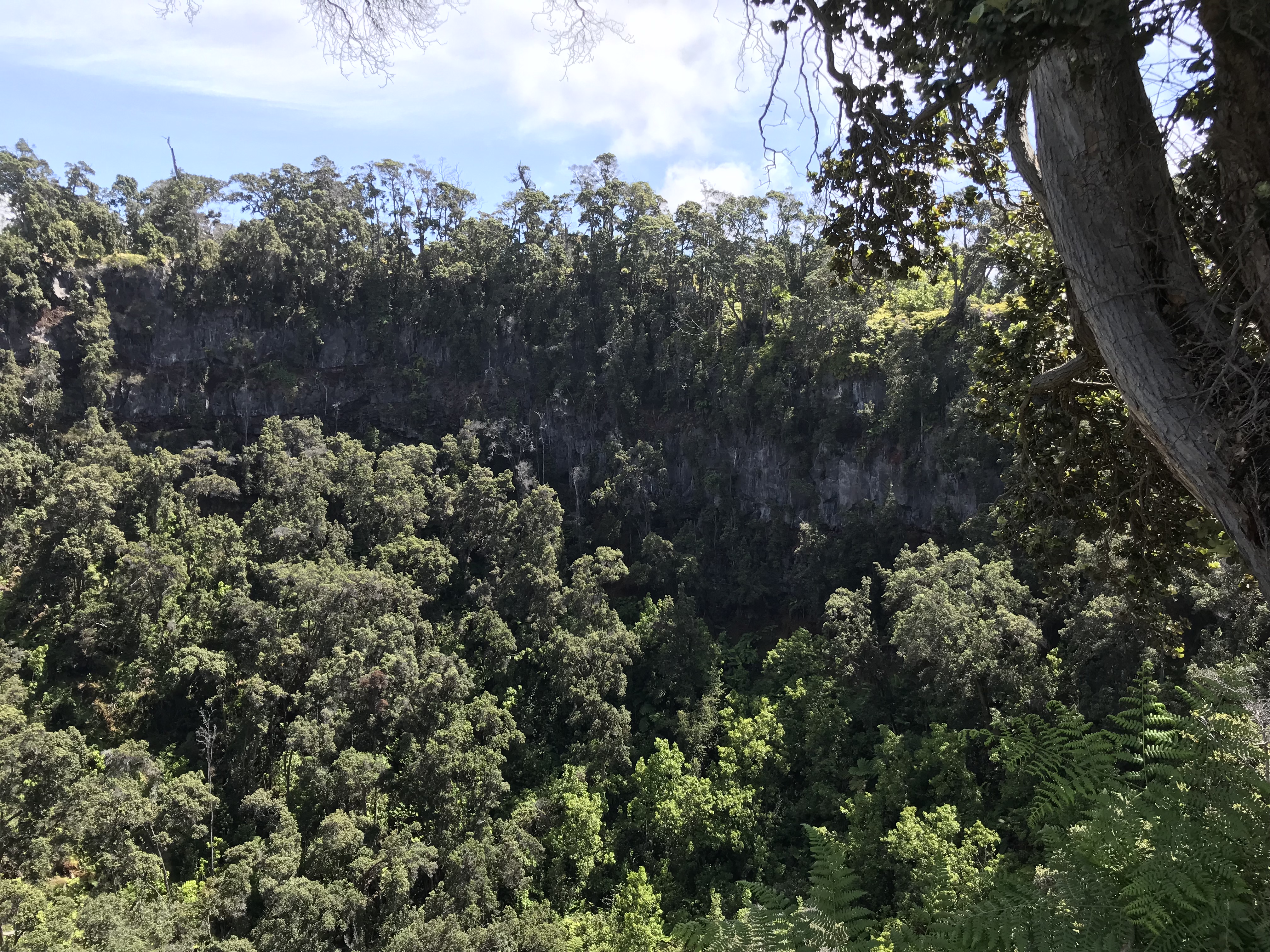 Yesterday I was able to make the last hike I had on my list to the Forested Pit Crater at the nearby Kahuku Station. Except for the Green Sand Beach hike these 4 1/2-5 mile hikes I have been by myself down, there and back. The Pit Crater hike is a 900 foot elevation change (think the first 300 feet is within a 1/4 mile of where I parked, puff, puff!!) on a recently reopened mowed trail through grassy pasture and o’hia woods. There is a fence near the edge of the crater to keep folks from leaning in so not to worry for the single hiker. Like everywhere the end result is a wonder. If I imagine the trees and shrubs stripped away in a way I can see the crater something like the quarries at home except this one is nature made and not in the inverted bell shape but the other way around.