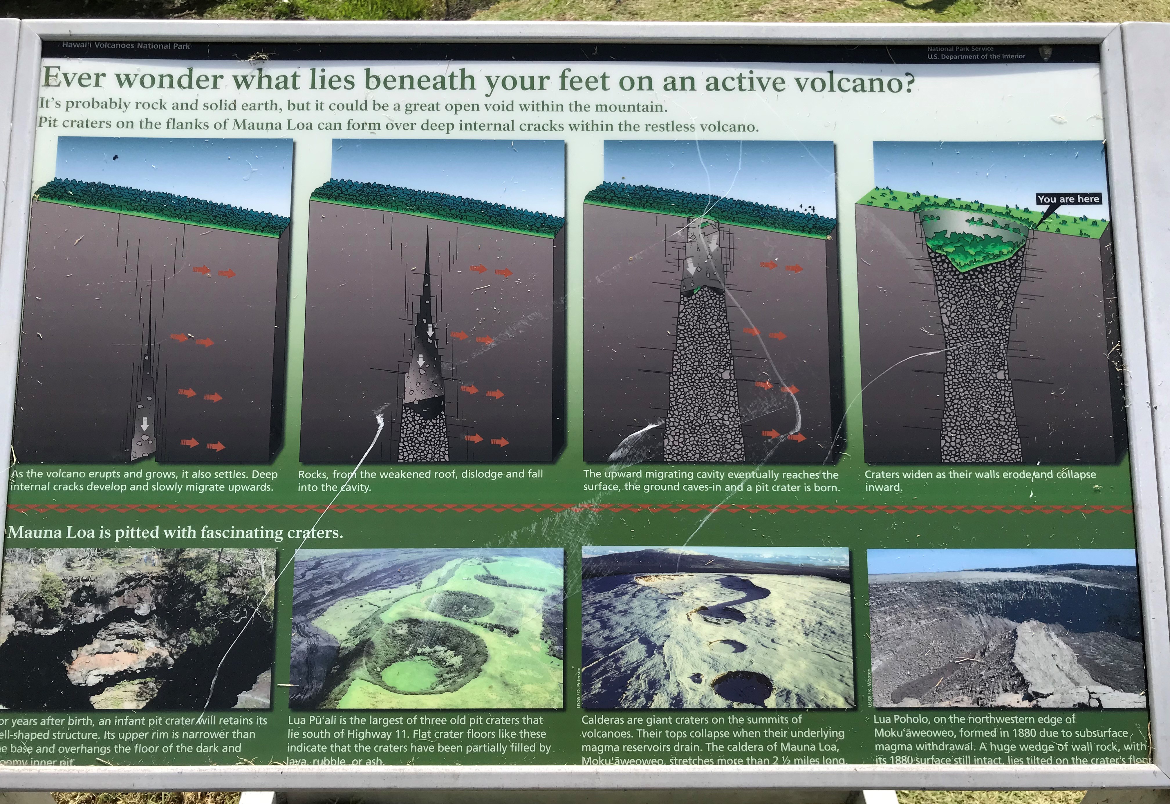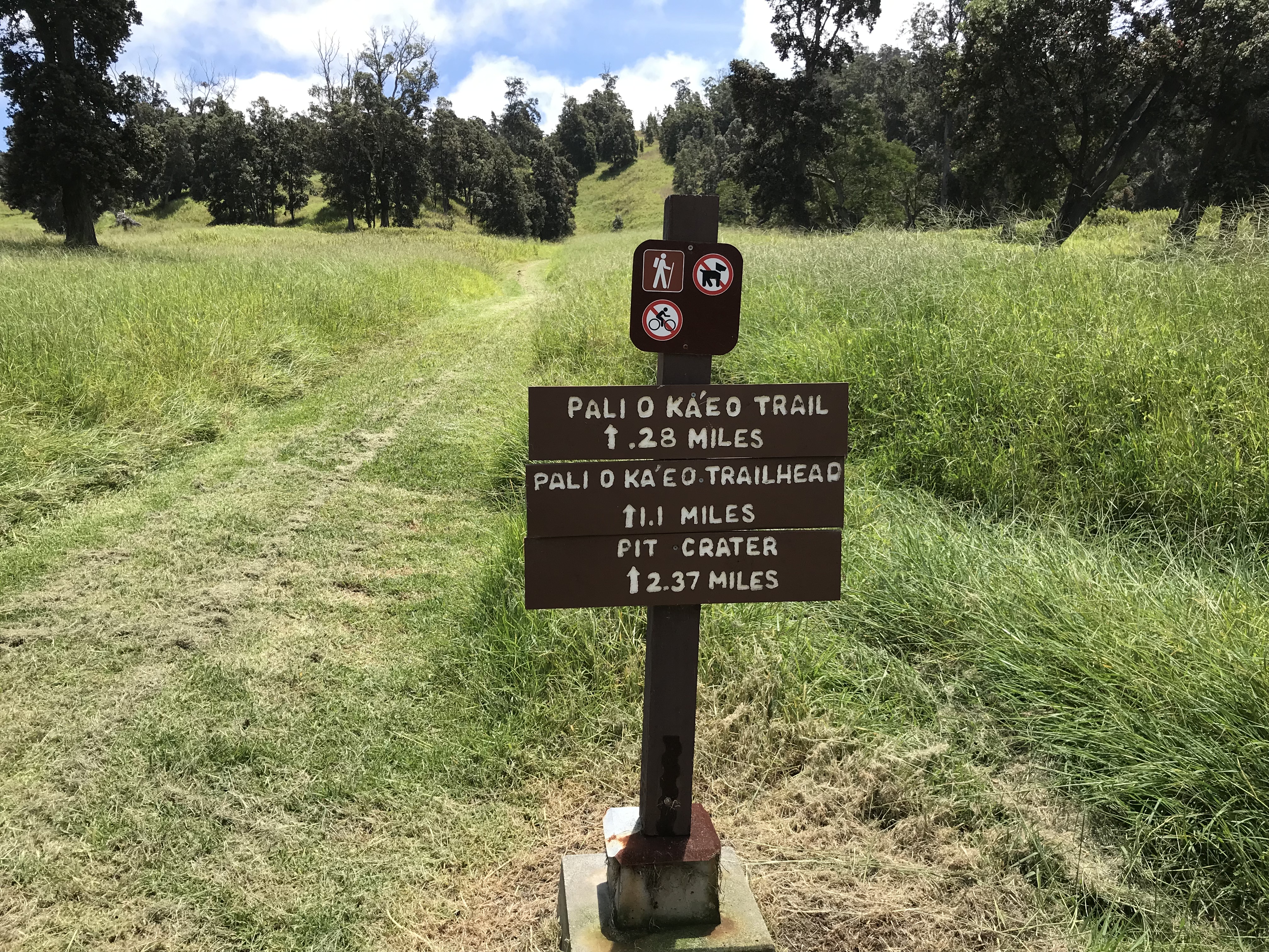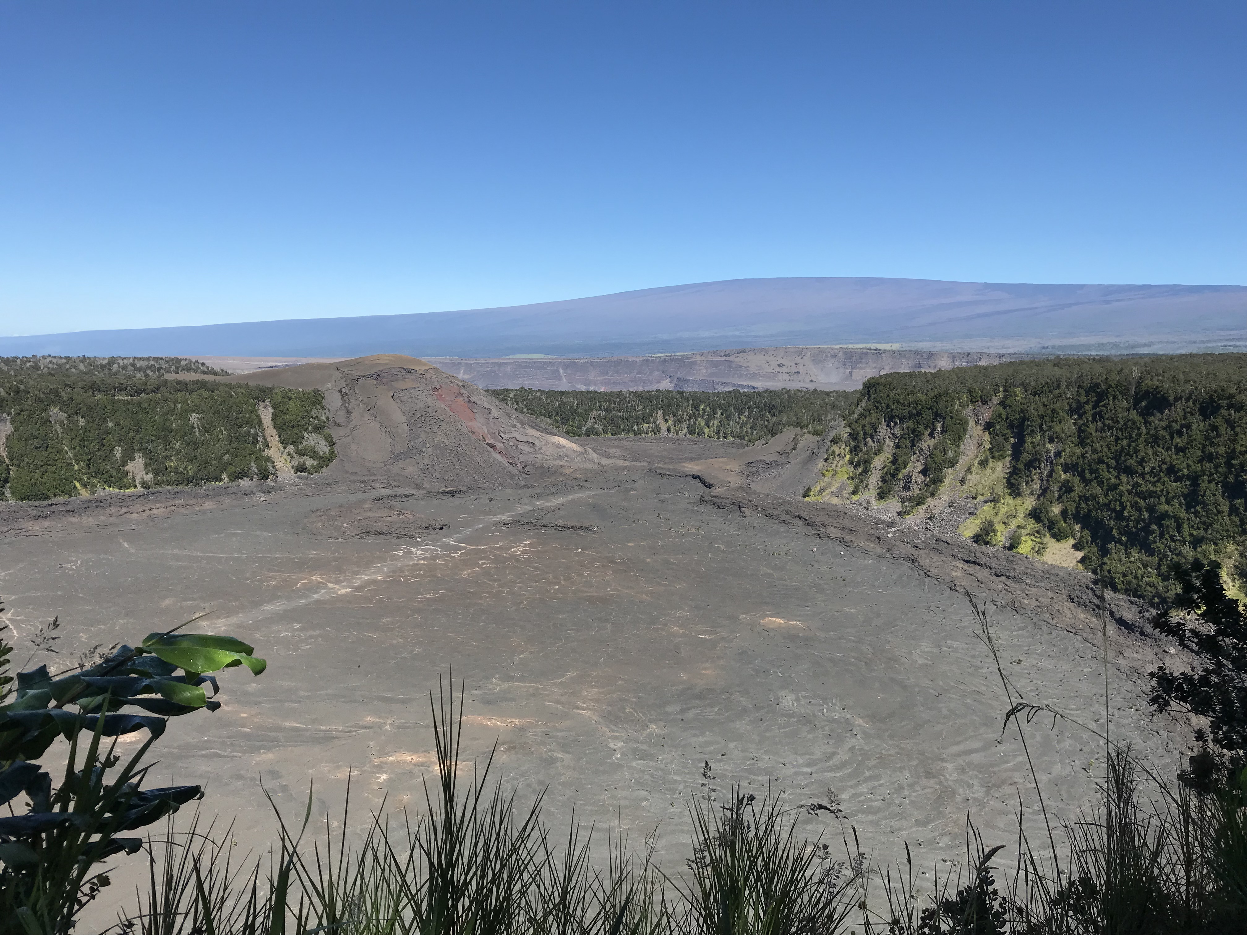 Yesterday I was able to make the last hike I had on my list to the Forested Pit Crater at the nearby Kahuku Station. Except for the Green Sand Beach hike these 4 1/2-5 mile hikes I have been by myself down, there and back. The Pit Crater hike is a 900 foot elevation change (think the first 300 feet is within a 1/4 mile of where I parked, puff, puff!!) on a recently reopened mowed trail through grassy pasture and o’hia woods. There is a fence near the edge of the crater to keep folks from leaning in so not to worry for the single hiker. Like everywhere the end result is a wonder. If I imagine the trees and shrubs stripped away in a way I can see the crater something like the quarries at home except this one is nature made and not in the inverted bell shape but the other way around.