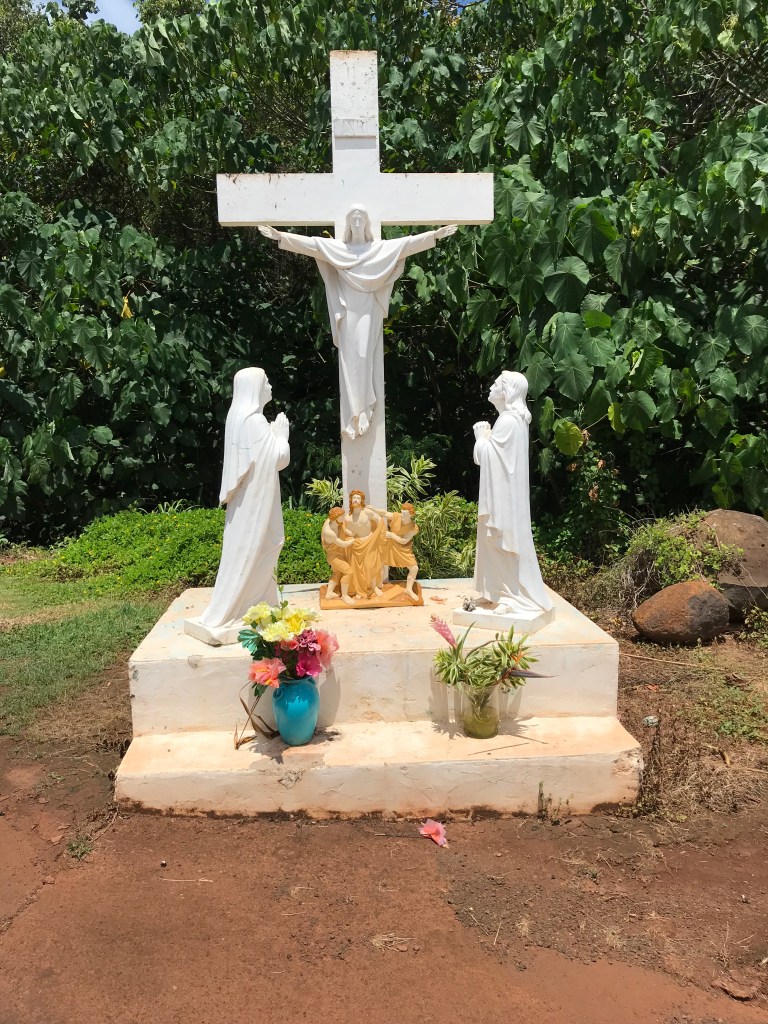 “Guardian of Kamahameha”)- the Hawaii Belt Road we come to a sign “Milolii Road”, take it, there’s no plan, the road less traveled, eh? The drive down from 1,100 feet takes as long as the drive to get to the turn, around and around, back and forth, like the ocean that moved me last night swimming at the beach. Just relax, go with it, no hurry, no worry. A saying from the lu’au was you come to the islands one way and you left with “more power and more love”. So here we are, our last morning sharing this experience. With my sister! We turn and go down and around. What a surprise!
